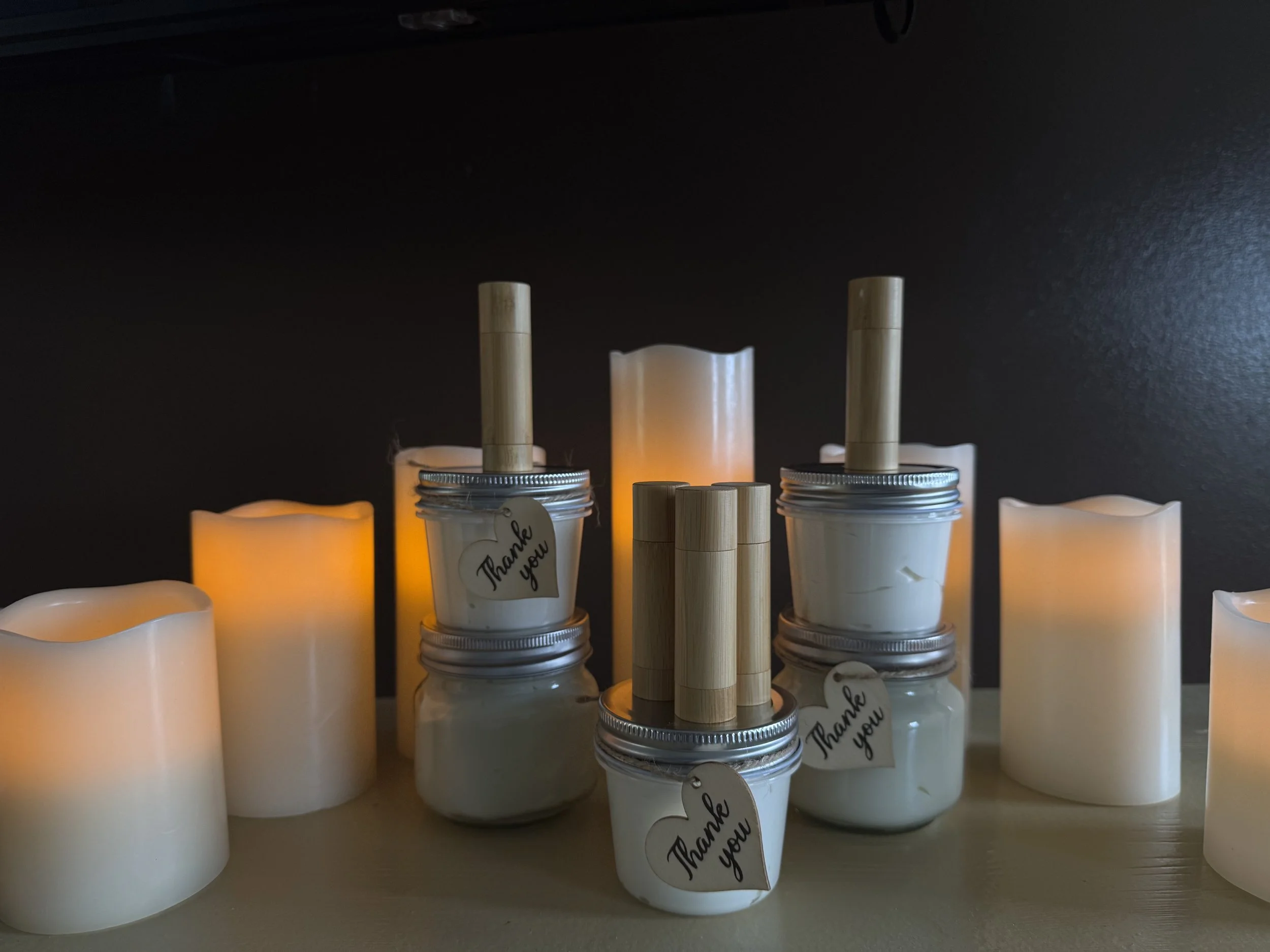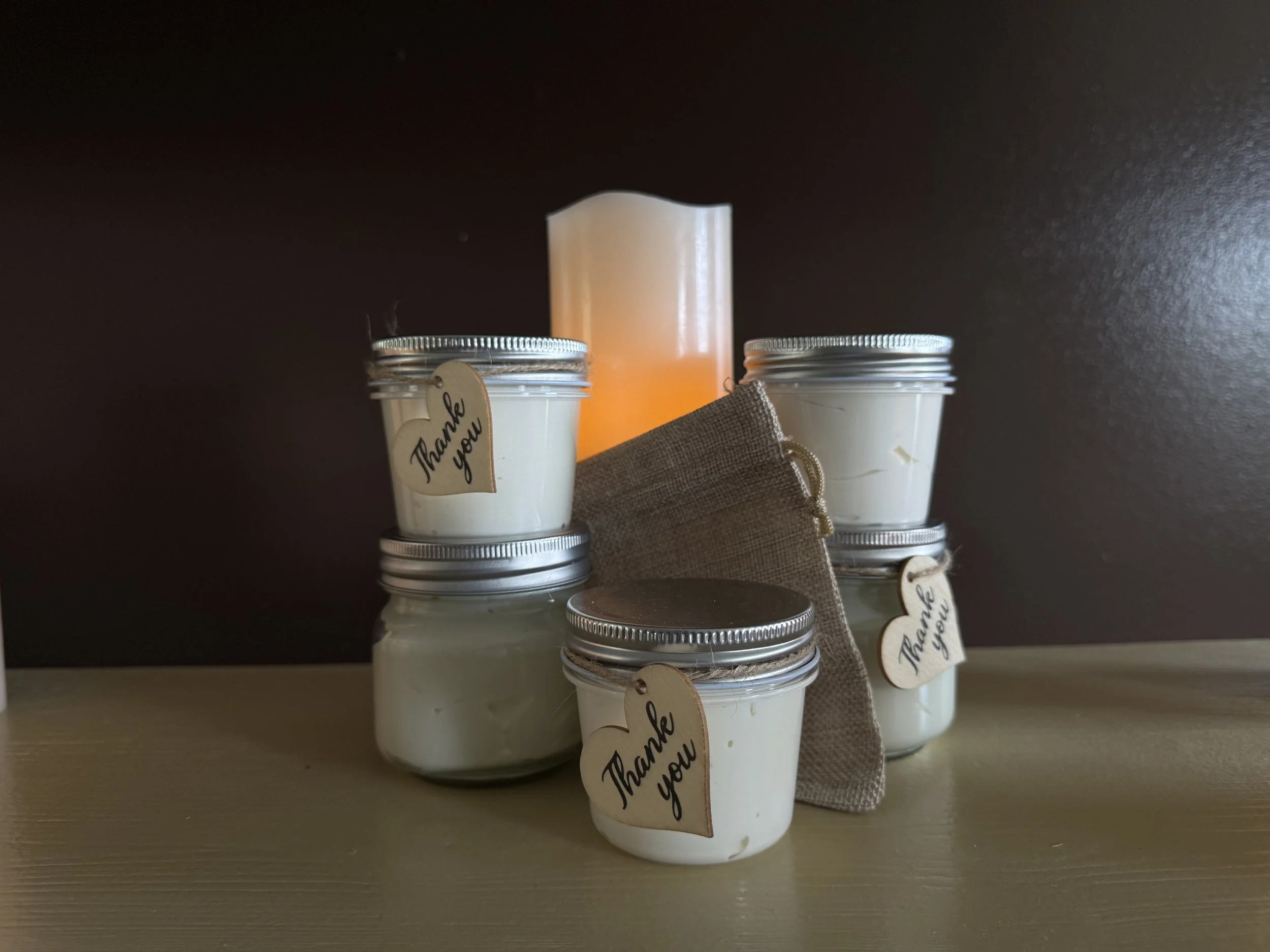 Five small glass jars with silver lids filled with white cream or yogurt, each with a tag that says 'Thank you.' The jars are arranged in front of a large orange candle, and a beige cloth napkin is draped among them, all on a wooden surface against a dark background.