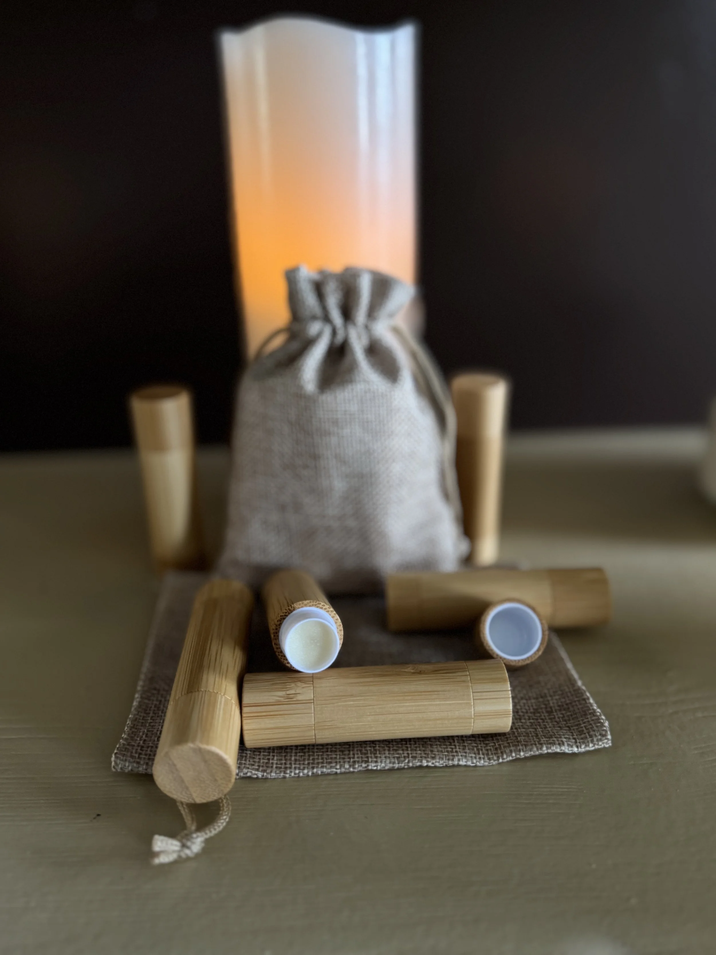 A set of bamboo massage rollers, a bag of bath salts, and a large candle with a woven cloth backdrop on a table.